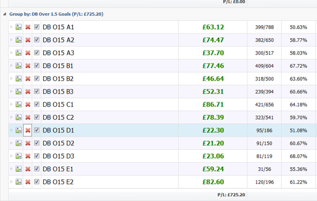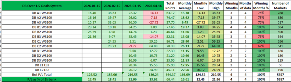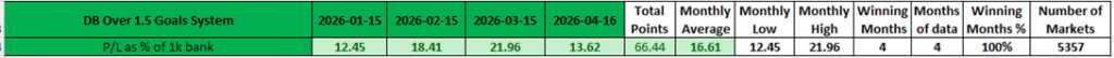 This system backs the Over 1.5 Goals Selection in markets that meet the strategy criteria.