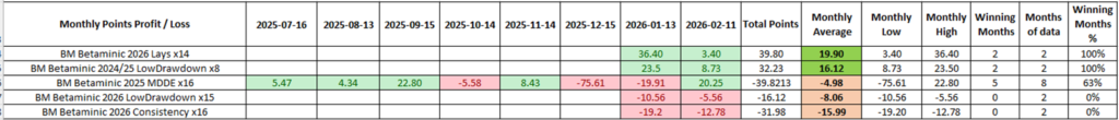 Betaminic back strategies 2 out of 2 months in profit, +16% average monthly profit, Whitaker staking