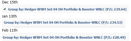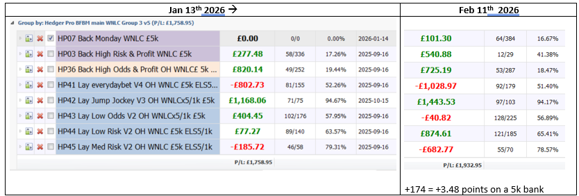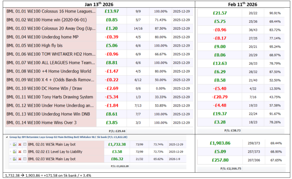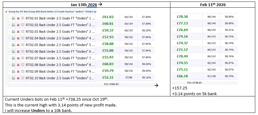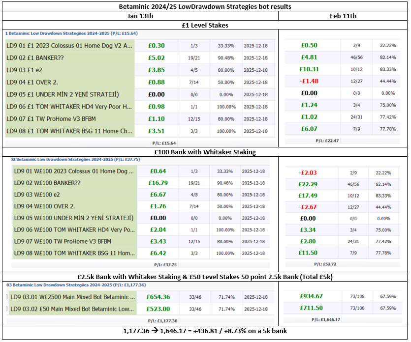 If you used the 7 systems I follow now, and applied a 5k bank to each, making 5k x 7 systems = 35k conservative nominal bank, then if the results I have had repeat themselves you could aim for a 5% increase on the bank each month on average over a 12 month period. (5% of 35k = 1.75k per month) I use the 5k number because Slipstream has a minimum bank entry level of 5k. That would be using Whitaker staking on BFBM bots with Betfair Exchange. If you use a 5k working bank with refills when a losing month comes, then it would be aiming for a 35% monthly increase on the 5k bank.