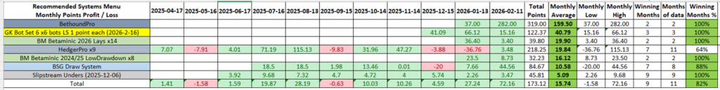4 Betting System Menu: All Systems Monthly Results in One Table