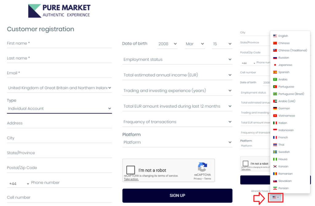 The sign-up page looks like this. The site is available in several languages.