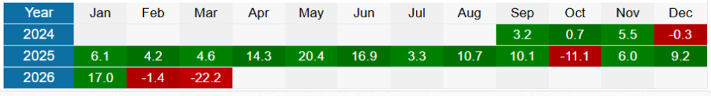 Past performance suggests +47% per year. (Based on +3.3% per month average after profit share.)
