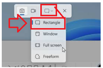 I usually press “windows key + shift + s”, then the screen dims to dark with a menu at the top.