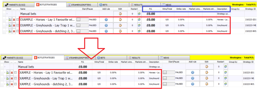 I don’t need to screenshot the Start/Pause, Add Rule, Edit and Restart columns each time, so I move the key data columns over to the left, next to the strategy name. Then I only need to screenshot a smaller area each time. It keeps my Word documents easier to manage.