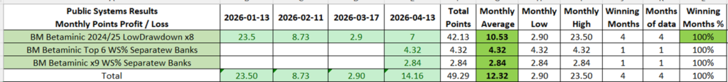 - 9 public strategies combined in the Betaminic Super9 system (averaged 349 points profit per year since 2012)
